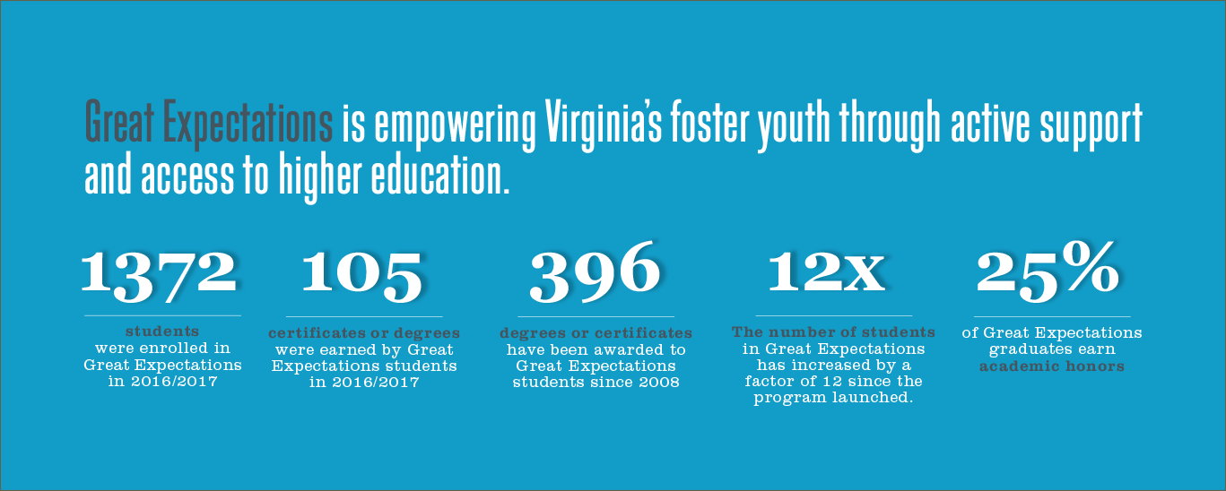 Every student deserves a bright future. In Virginia, thousands of students who have experienced foster care find success through a Great Expectations program at one of Virginia’s Community Colleges. From selecting a school to securing financial aid to cover your tuition, Great Expectations can make it happen for you.